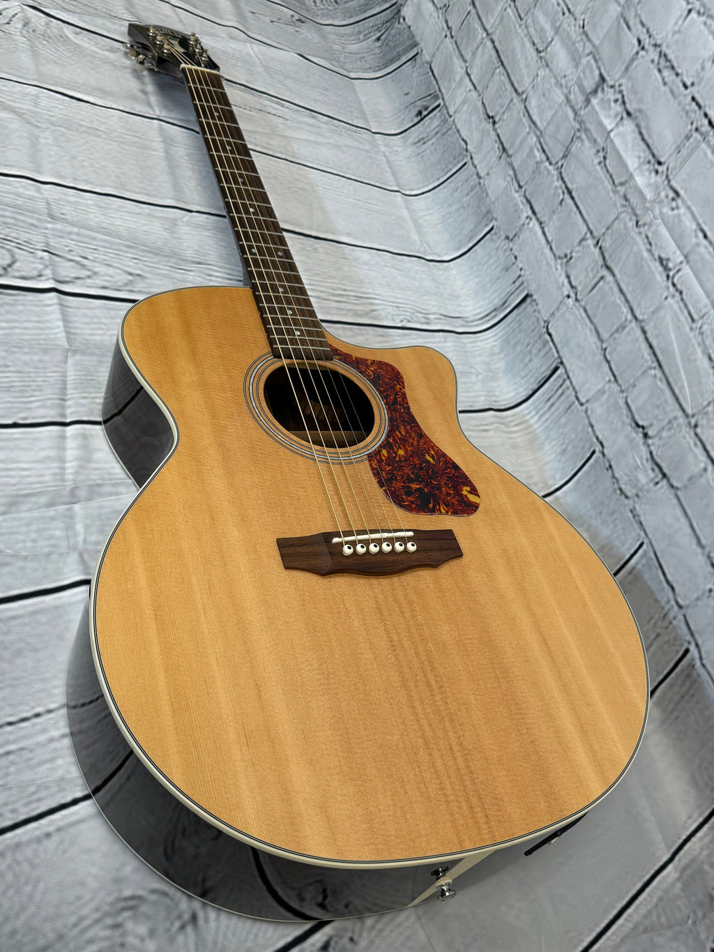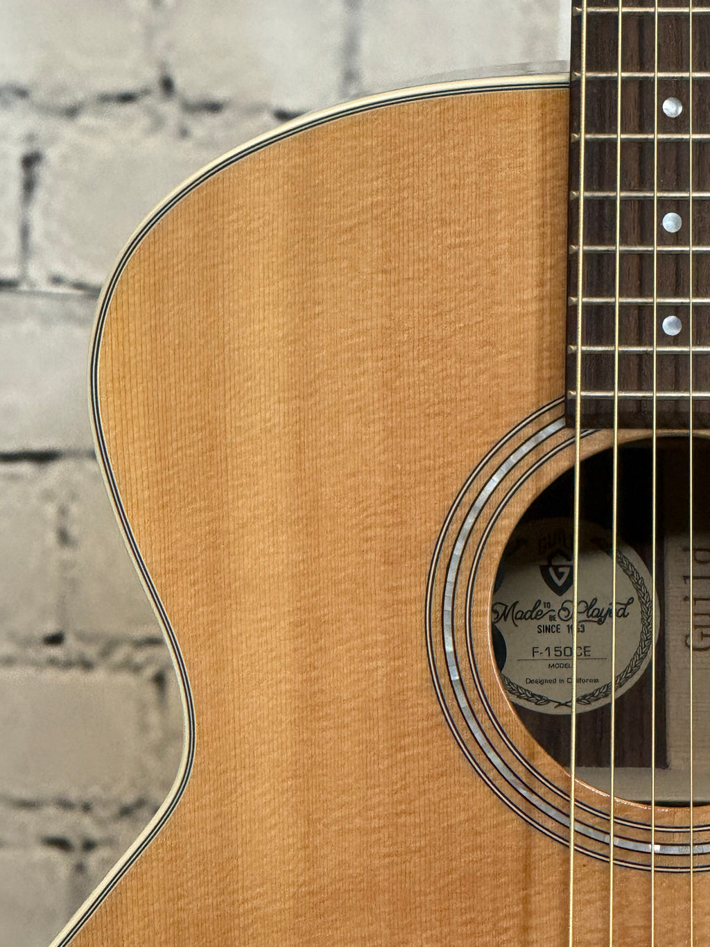 Used Guild F-150CE featuring aSolid Sitka Spruce top construction with Solid Indian Rosewood back and sides, Guild/Fishman GT-1 Pickup System, Jumbo Cutaway body style, Three Ring with Mother-of-Pearl Center rosette and Guild Peak Logo with Chesterfield - Mother-of-Pearl headstock logo,Comfortable c-shaped neck, Rosewood fingerboard and bridge and aNatural gloss finish. Comes with a gig bag.